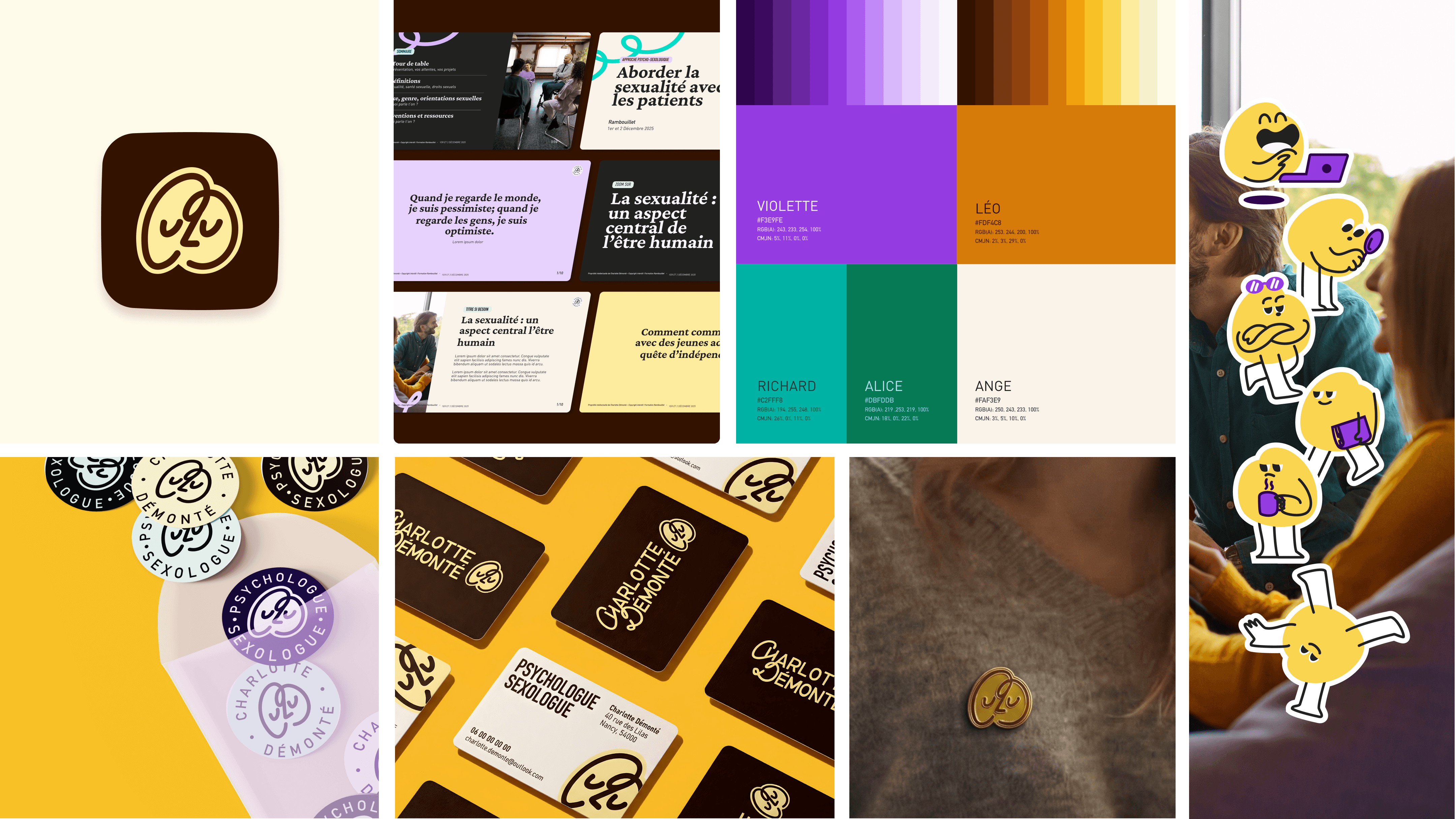 L’identité visuelle conçue pour elle exprime cette posture. Un univers chaleureux, clair et rassurant, pensé pour soutenir son discours plutôt que le surcharger. Le logotype, les couleurs et les formes créent un cadre où l’on se sent guidé, jamais perdu. Une identité qui parle avec douceur, mais qui reste solide et professionnelle.